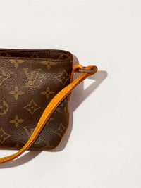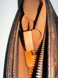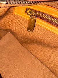Good. The Monogram coated canvas is in very good condition with no cracks, peeling, or significant wear. The vachetta leather base and strap have developed a deep, rich patina with some surface marks on the base — consistent with gentle use over time and adding character to the piece. The top zipper functions smoothly. The brown canvas interior lining is clean and well-maintained with one open pocket in excellent condition. Hardware shows light patina consistent with age.